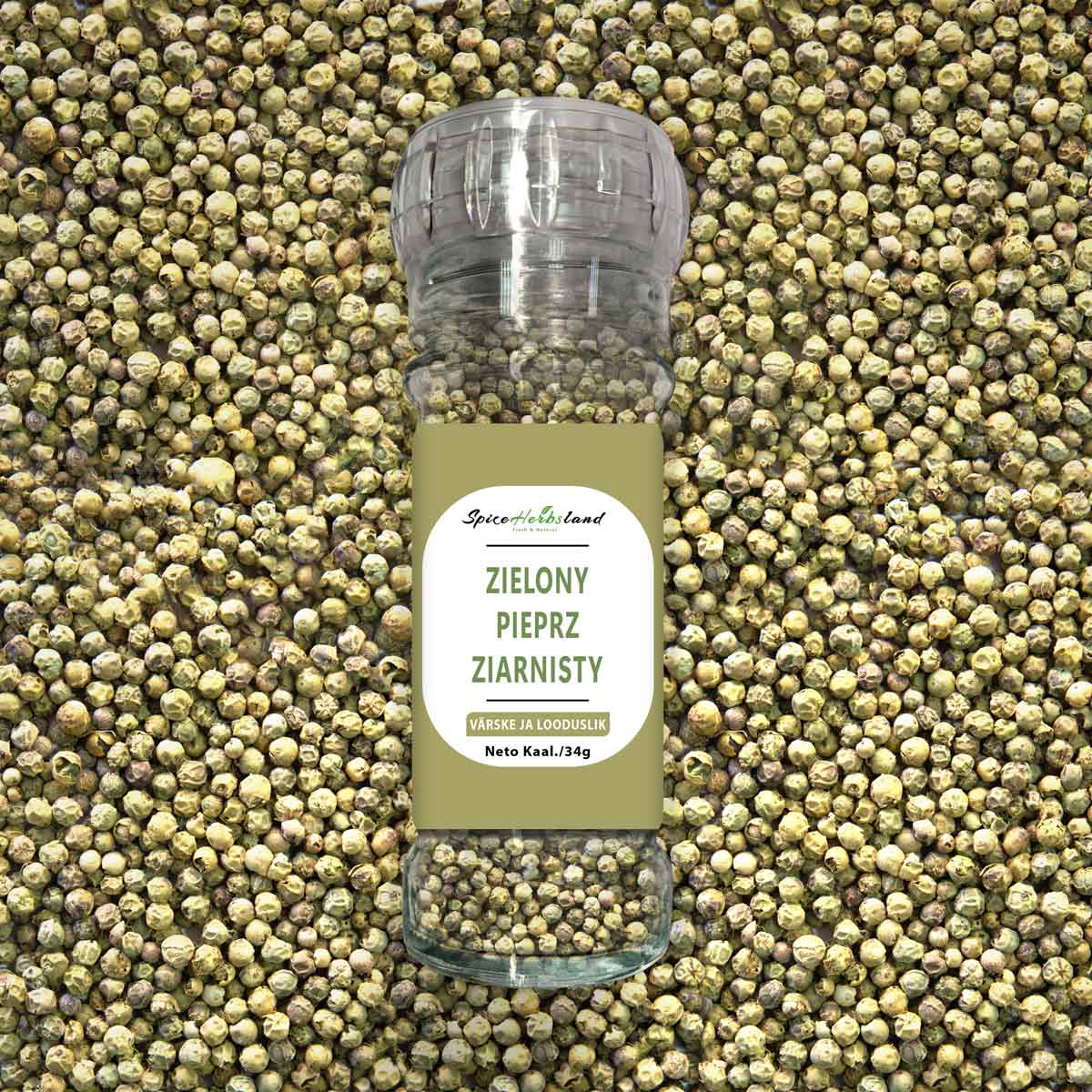 Ziarna zielonego pieprzu to niedojrzałe owoce czarnego pieprzu (Piper nigrum). Mają łagodniejszy smak w porównaniu do swoich dojrzałych odpowiedników, dzięki czemu są doskonałym dodatkiem do delikatnych potraw, takich jak jajecznica, frytki, kurczak, ryby i kremowe sosy.